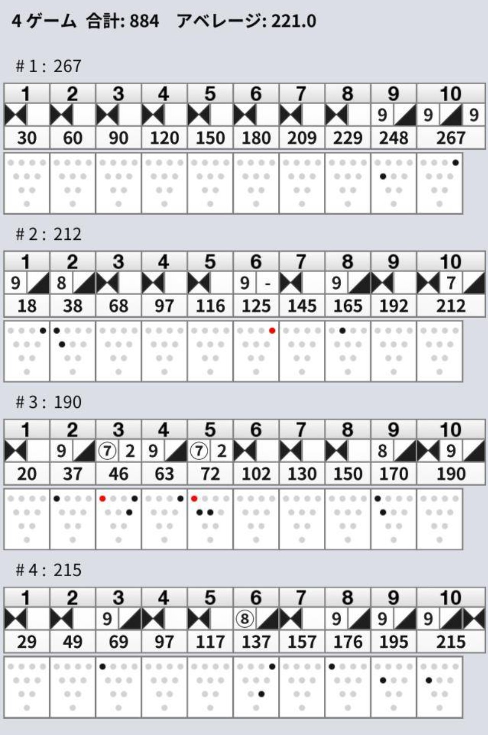 1ゲーム目はいきなり1フレームから8フレームまでストライクが続き、さすがに少しだけパーフェクトを意識したところで、その流れはあっさり終了しましたが、その後も大きく崩れることなくスコアは安定していました。