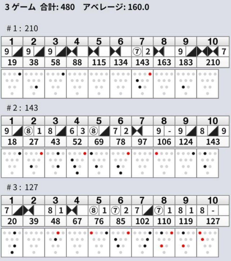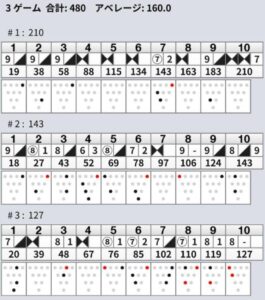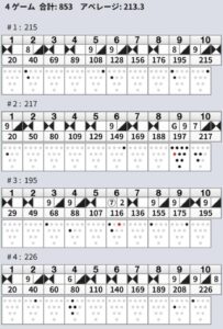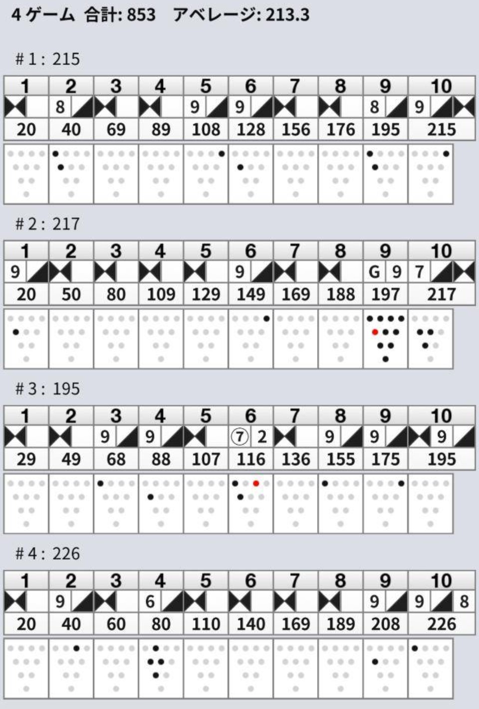 4ゲームを通してのミスは、スプリットとガターがそれぞれ1回ずつのみ。大きく崩れる場面もなく、終始落ち着いた投球ができました。ここ最近は「投げ込まなければ感覚が保てない」と思い込んでいましたが、もしかすると練習量を抑え、間隔を空けた方がスコアが安定するタイプなのかもしれません。