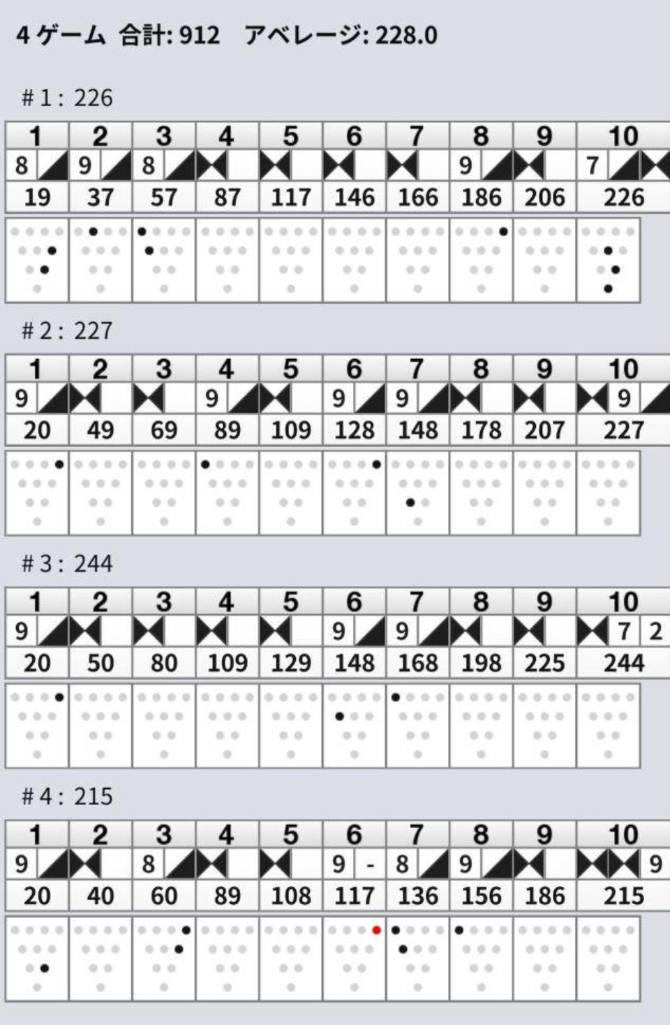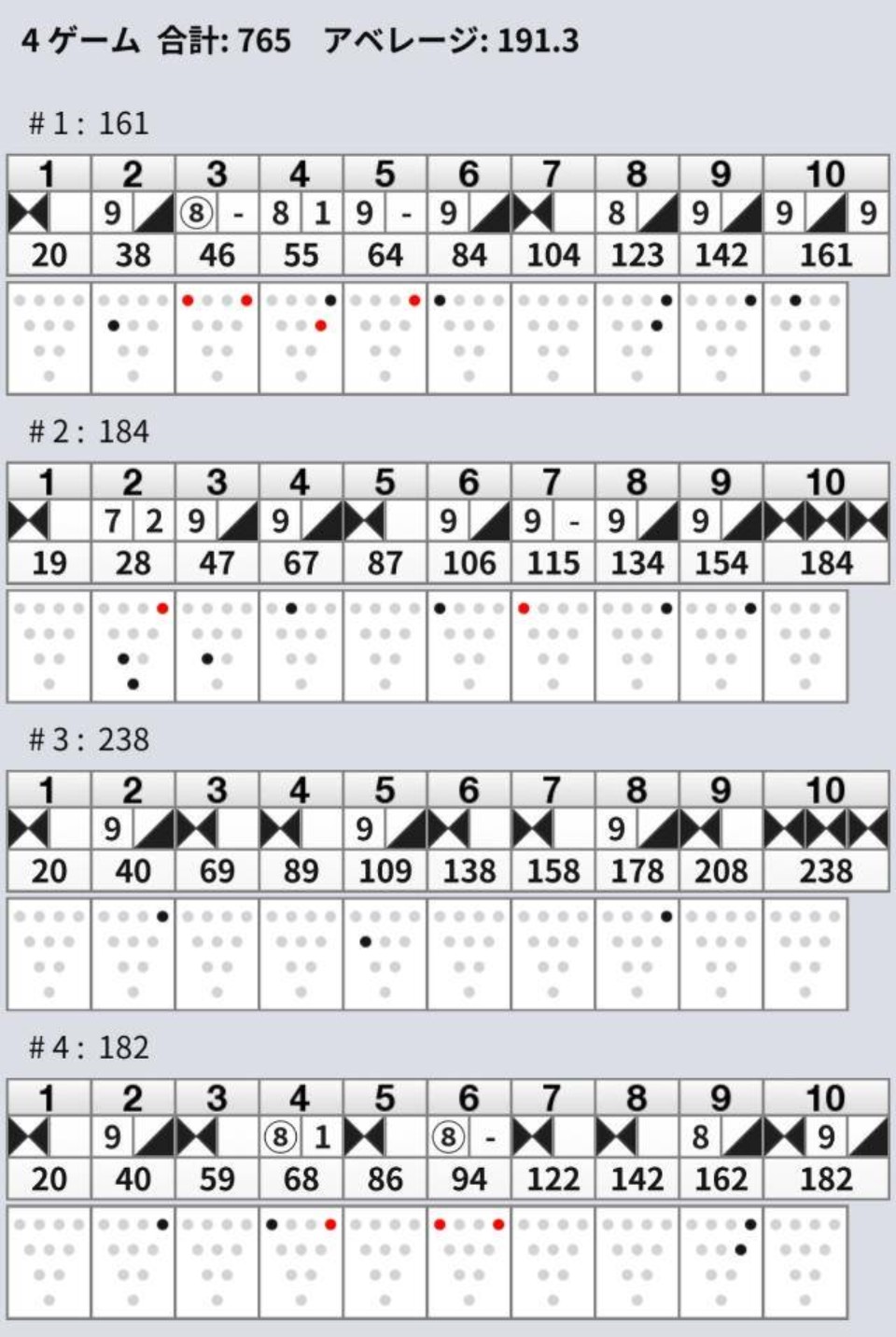 内容としては悪くなく、ストライクも量産できていましたが、4ゲーム目での10ピンミスが悔やまれます。あの一本がなければ、もう一段階上の結果も見えていたかもしれません。こういう“あと一本”が、今後ハンデ0で戦う上ではより重要になってくるのでしょう。