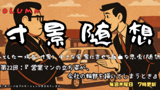 寸景随想-コラム- 寸景随想#22 営業マンの立ち姿が会社の輪郭を描いてしまうとき 自動車の現車査定で出会った複数の営業マン。その言葉遣いや立ち振る舞いから感じた「企業の顔」としての営業の在り方とは。査定額では測れない違和感と気づきを綴るコラム。 2026.01.01 寸景随想-コラム-